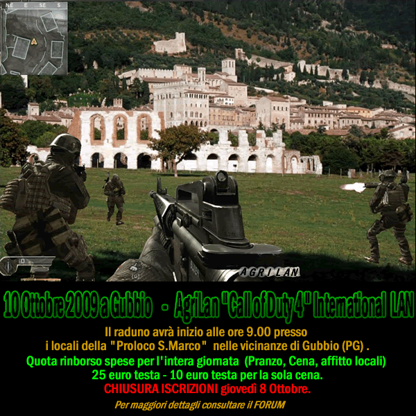 La location della LAN sta a circa 3 kilometri da Gubbio .... non so se Bibaz lavora (mia moglie) se ? libera posso chiedergli di accompagnare le ragazze a fare un giro per Gubbio.... ma non garantisco. Cmq (come vedete dalla locandina) si tratta di un Paesone riescono tranquillamente a visitarlo tutto anche dasole nello stesso tempo che noi impieghiamo a fare 25 TDM .  ;)